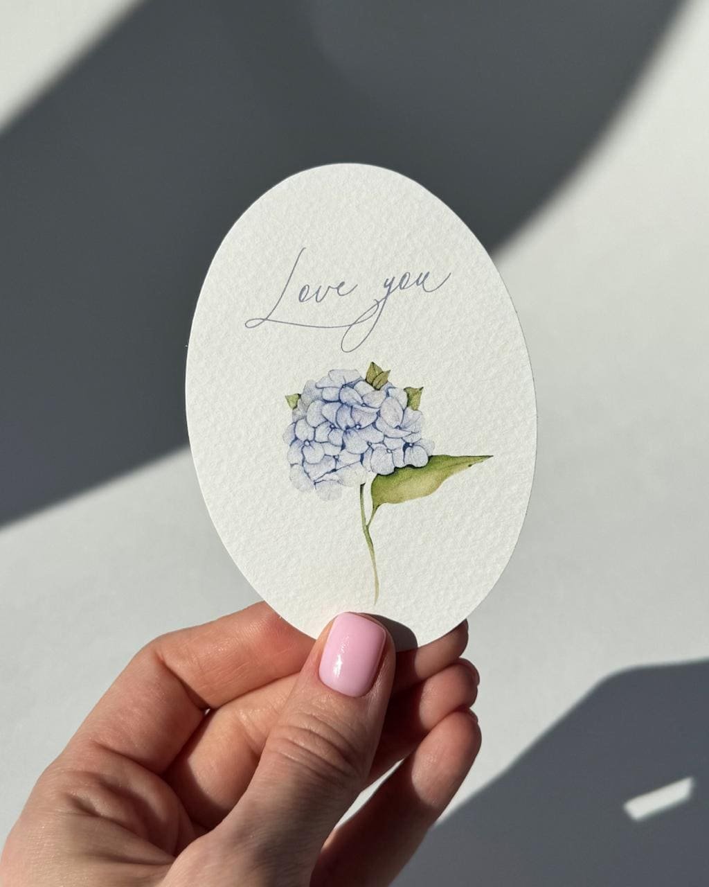 Дуже гарна овальна листівка на дизайнерському картоні Tintoretto Gesso з ілюстрацією гортензії та написом “Love you”. Розмір листівки 10*7 см. Друк односторонній – зворот листівки білого кольору.