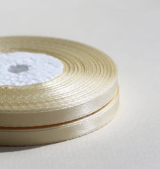 Атласна ніжно кремова стрічка в рулоні 23 метри, шириною в 0,6 см. Чудово підійде для пакування подарунків, букетів та святкових смаколиків