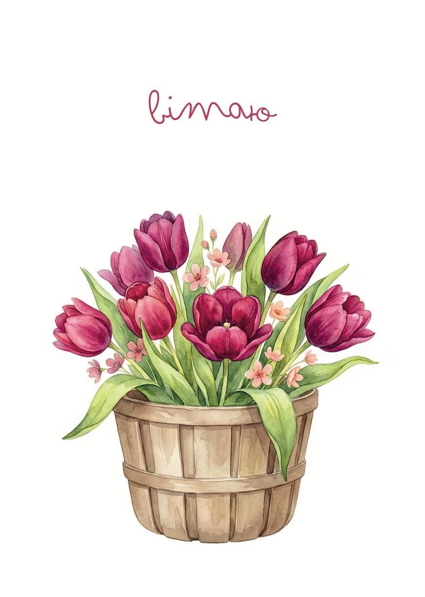 Листівка на дизайнерському картоні Tintoretto. На листівці зображені акварельні тюльпани кольору марсала в кошику. Друк односторонній – зворот листівки білого кольору